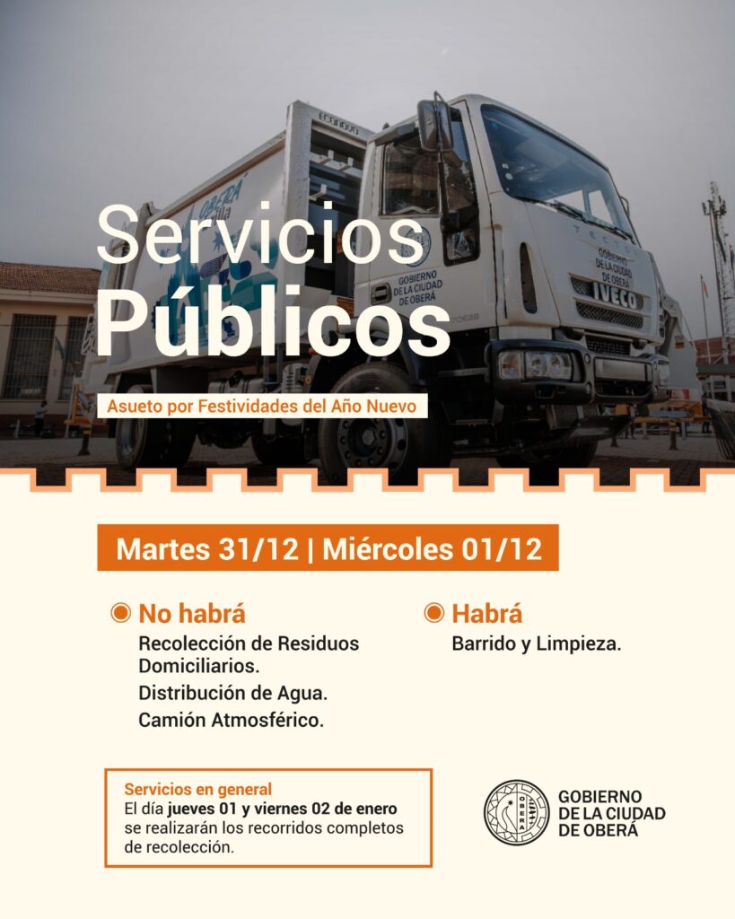 El martes 31 y miércoles 01 de enero de 2025, es asueto y feriado por las festividades de fin de año. El Gobierno de la Ciudad informa que no habrá servicio de recolección de residuos domiciliarios, distribución de agua y camión atmosférico en cambio sí se realizará barrido y limpieza.