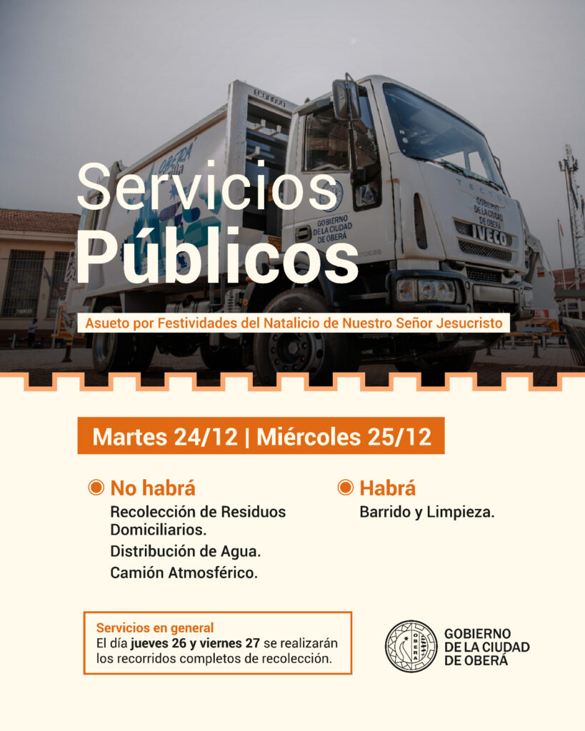 El próximo martes 24 y miércoles 25 de diciembre, asueto y feriado por las festividades del natalicio de nuestro señor Jesucristo, no habrá servicio de recolección de residuos domiciliarios, distribución de agua y camión atmosférico en cambio sí se realizará barrido y limpieza.
