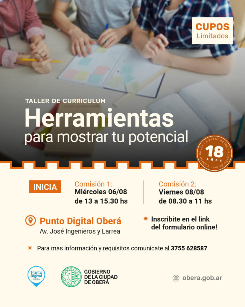 El Gobierno de la ciudad de Oberá, a través del Departamento de Capacitación y el Punto Digital. Llevan adelante la propuesta del taller de currículum moderno. Con una duración de clases de 2 horas y 30 minutos (se repite consecutivamente los miércoles y viernes durante 4 semanas).