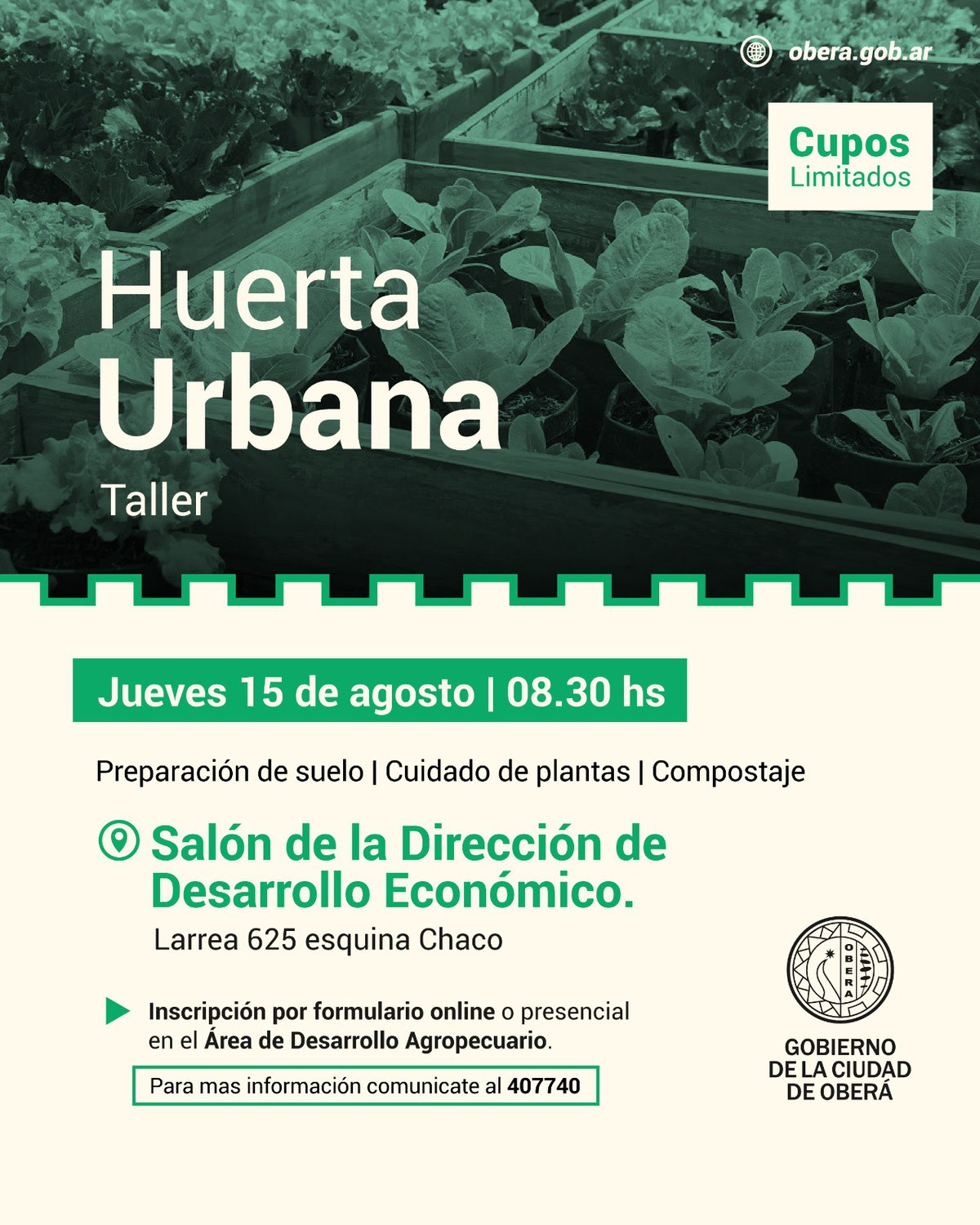 Debido a la demanda, el Gobierno de la Ciudad de Oberá ofrece una nueva edición del taller de Huertas Urbanas el próximo jueves 15 de agosto a las 8:30 horas. El evento se llevará a cabo en el Salón de la Dirección de Desarrollo Económico, ubicado en la calle Larrea 625 esquina Chaco.
