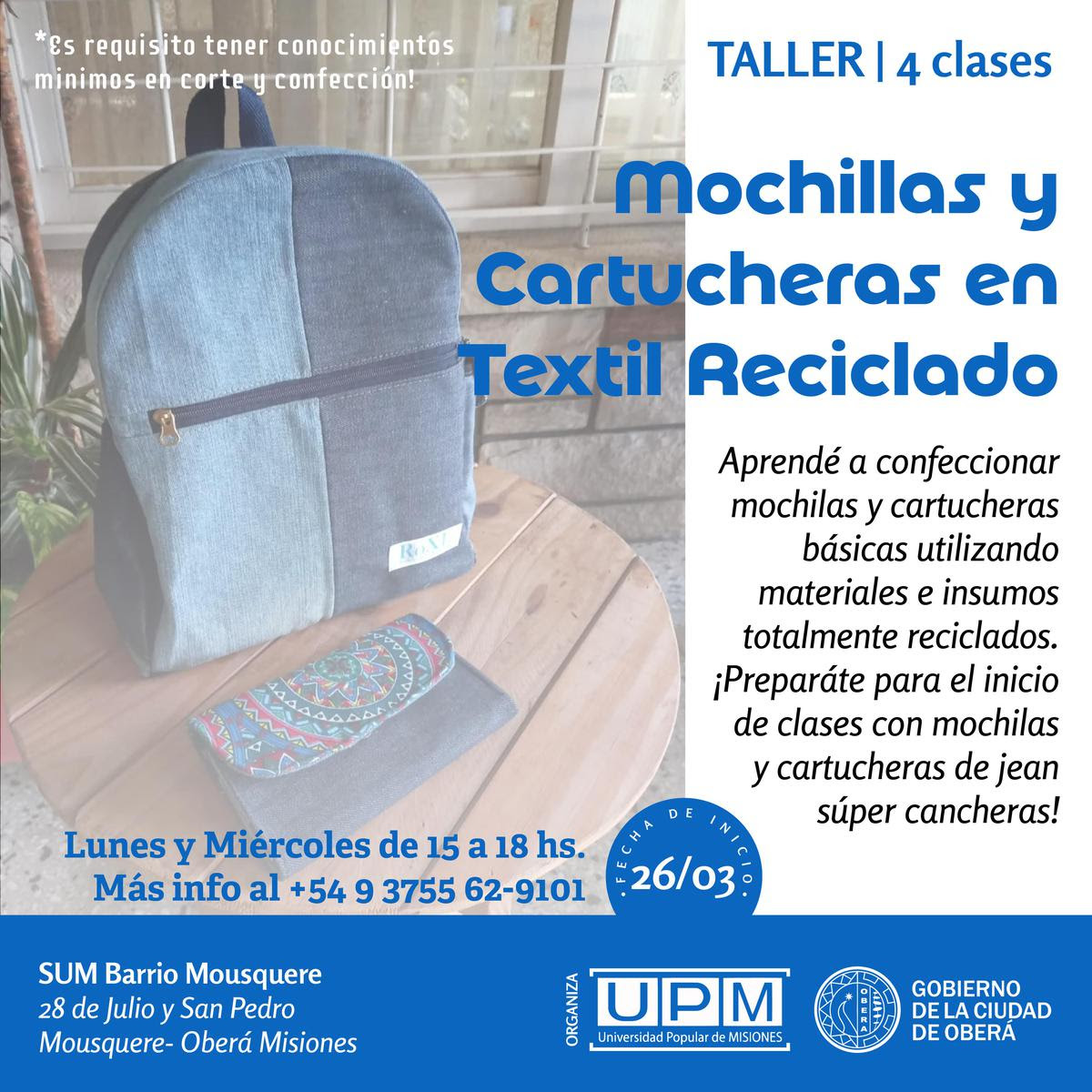 El Gobierno de la Ciudad de Oberá y la Universidad Popular de Misiones ofrecen el Taller de Confección de Mochilas y Cartucheras con Textil Reciclado