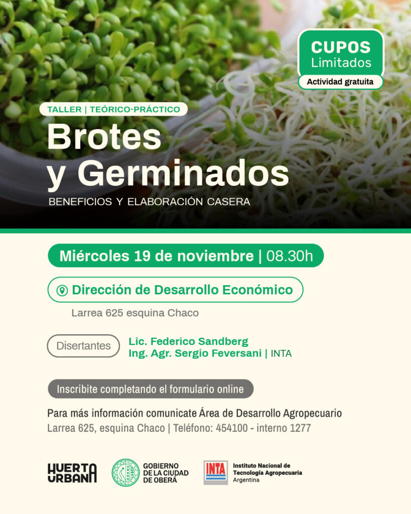 El Gobierno de la Ciudad de Oberá, a través de la Dirección de Desarrollo Económico y el Departamento de Promoción de la Salud, junto al INTA Oberá, invita a participar del Taller sobre Brotes y Germinados: beneficios y elaboración casera.