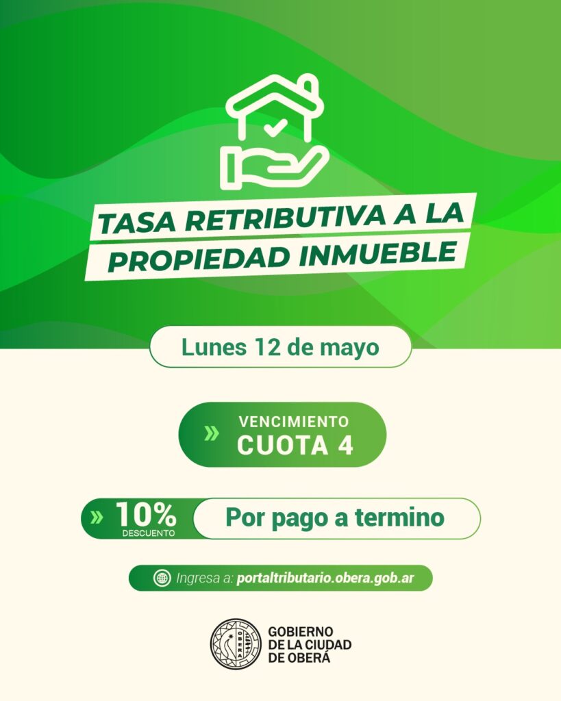 El Gobierno de la Ciudad informa que vence el lunes 12 de mayo la tasa retributiva a la propiedad inmueble. Tendrá un descuento del 10 % por pago a término, abonando de forma online o presencial.